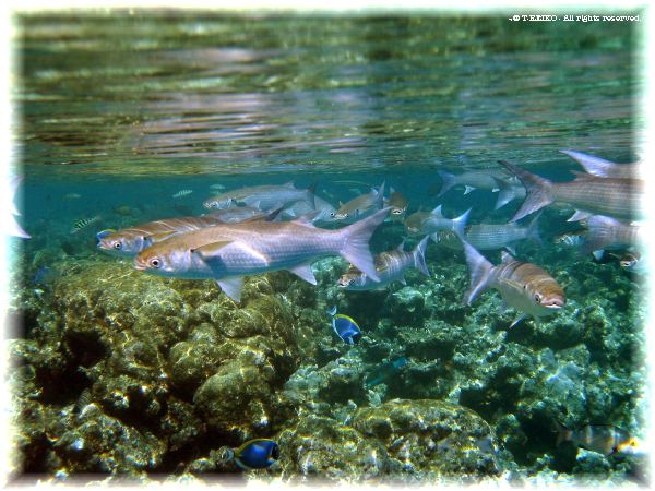 こんなに浅いところでも珊瑚と魚はいっぱいです。